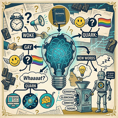Woke used to mean one thing.... now it is just confusing... Gay was happy once.... Quark can mean a Desktop publishing program....or a fundamental particle or a type of cheese!....why don't we just make up some more words?...is it a lack of imagination?...what do you think?....if that is too tiring maybe we could get AI to do it for us...it saves us from thinking doesn't it
