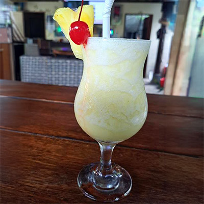 Please alter this to suit your own taste buds. 1 shot (30ml) of white rum. 1 shot of coconut cream or 2 of coconut milk. A few frozen, chopped pineapple pieces. A splash of lime juice. A bit of crushed ice. Throw into blender and mix for a short time. Pour into a fancy glass. Garnish with a cherry and a wedge of pineapple. We sell a lot of these at our bar in Bali (Indonesia)