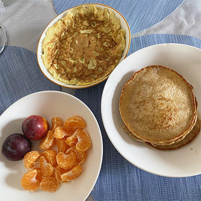 Start your day with soft whole wheat+oats pancakes and a fluffy omelette served with fresh fruits like mandarins and plums. Mix flour, milk, egg, and a little butter for pancakes; cook until golden. Beat eggs with salt and milk for the omelette and cook till light and fluffy. Simple, healthy, and full of morning energy.