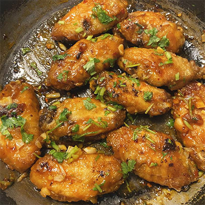 Ingredients: 8 10 chicken wings 2 tbsp oil 2 tbsp soy sauce 1 tbsp chili sauce 1 tbsp honey 4 cloves garlic, chopped 1 tsp chili flakes 1 tbsp fresh coriander/green onion (chopped) Salt & pepper to taste Instructions: 1. Season wings with a little salt and pepper, then pan-fry until golden brown and cooked through. 2. In the same pan, add garlic, onion, and chili flakes, sauté until fragrant. 3. Stir in soy sauce, chili sauce, and honey. 4. Toss the...