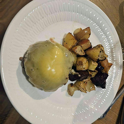 You will need a griddle pan and a lid or other pan to cover it Each burger is made out of 250 grams of beef mince(or pork and beef if you prefer...but make sure it is cooked enough!)....season the mince well with black pepper and salt...shape them into balls and then put them into the fridge for 24 hours (there is some evaporation and the mince bounds tightly together...there is a real difference. Next chop up chunks of beetroot onion and potatoes in equal quanties...add...