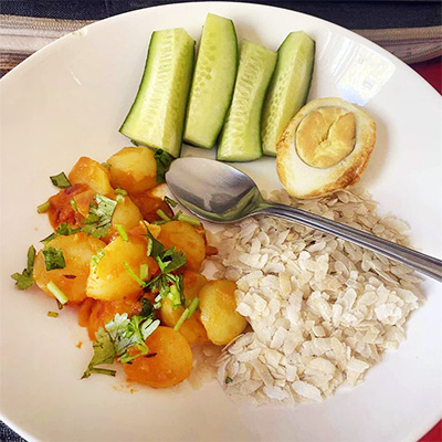 This is a simple and tasty Nepali-style breakfast made with spiced potatoes, flattened rice, boiled egg, and cucumber. First, boil and peel two medium potatoes, then cut them into small pieces. Heat a spoon of oil in a pan, add cumin seeds, and let them crackle. Add a little turmeric, chili powder, and salt, then mix in the boiled potatoes. Stir well and cook for a few minutes until the spices blend nicely. Garnish with chopped cilantro. On a plate, serve a handful of...