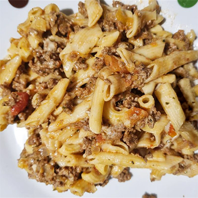 1 Tablespoon olive oil 1 onion (chopped) 2 cloves garlic (crushed) 500 grams beef mince 1x tin of chopped tomatoes 1 tbsp tomato paste 1 1/2cups beef stock 1 Tablespoon mixed herbs 1 Tablespoon Worcestershire sauce 2 cups penne pasta 1/2 cup grated cheese Heat the oil in a large pan over a medium heat. Add the onion and garlic and cook for 2 minutes. Add the mince and brown. Add tomatoes, tomato paste, beef stock, mixed herbs & worcestershire sauce...