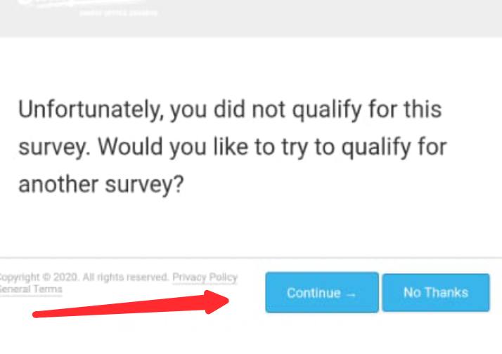 | Unfortunately, you did not qualify for this survey. Would you like to try to qualify for another survey? Continue No Thanks Why does it continue when you say "No Thanks"? | ||