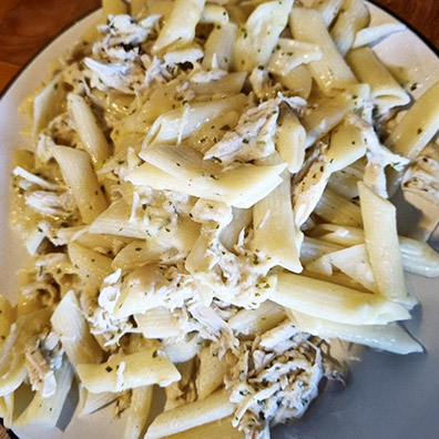 2 chicken breasts cooked and shredded 2 tbsp olive oil Salt and pepper 4 tablespoons unsalted butter 4 cloves garlic, minced 2 cups heavy cream 1 cup grated cheese 2 cups cooked penne pasta Heat oil in a fry pan and heat up the shredded chicken. Season with salt and pepper. Set aside In a large saucepan, melt the butter over medium heat. Add the minced garlic and cook for 2 minutes. Pour in the heavy cream and bring it to a simmer. Stir in the grated cheese and continue to cook for about 5 minutes, until the sauce thickens. Season with salt and pepper. In a large bowl mix the pasta, chicken and sauce together. | ||